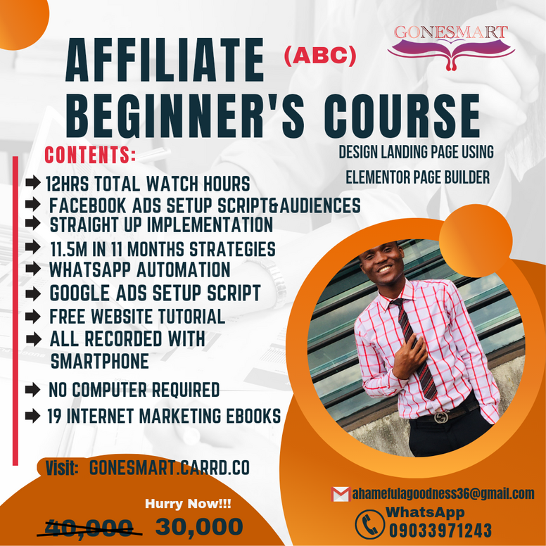 Just as this name "ABC", It's the easiest affiliate marketing training you can take today. No long stories. No beating about the bush! No too complex details.It's as easy as ABC!Should you want to master website designing using our own skills, A course on How to design a landing page using Elementor will be given to you FOR FREE if you're starting TODAY.Then to increase your internet marketing knowledge, 19 Internet marketing eBooks will be given to you FOR FREE IF you're ready TODAY.Again, to make your activities as an Affiliate marketer very stress free, a premium WhatsApp Auto responder will be given to you FOR FREE. If you check on Playstore, you'll see what this cost yearly. But you'll have access to it for free for a lifetime.I know you might be a novice when it comes to internet marketing, so you may not have some words to use to communicate your products, don't worry.You're in the hands of pro internet marketers. You’ll have access to ready-to-use scripts that have generated over 12M in one year.Again, one of the tools we use as Affiliate marketers is websites. This may cost money to get. Buh in a case where you don't have the finances to get 1 for yourself, you’ll learn how to get a website without spending 1kobo.Also, people who buy digital courses on the internet have been researched on. So you’ll be having access to the audience to use for your Facebook targeting. Be 100% guaranteed that these are audiences that will buy your product.Finally, you'll give you access to a training on how to appear on Google when people search about your product.